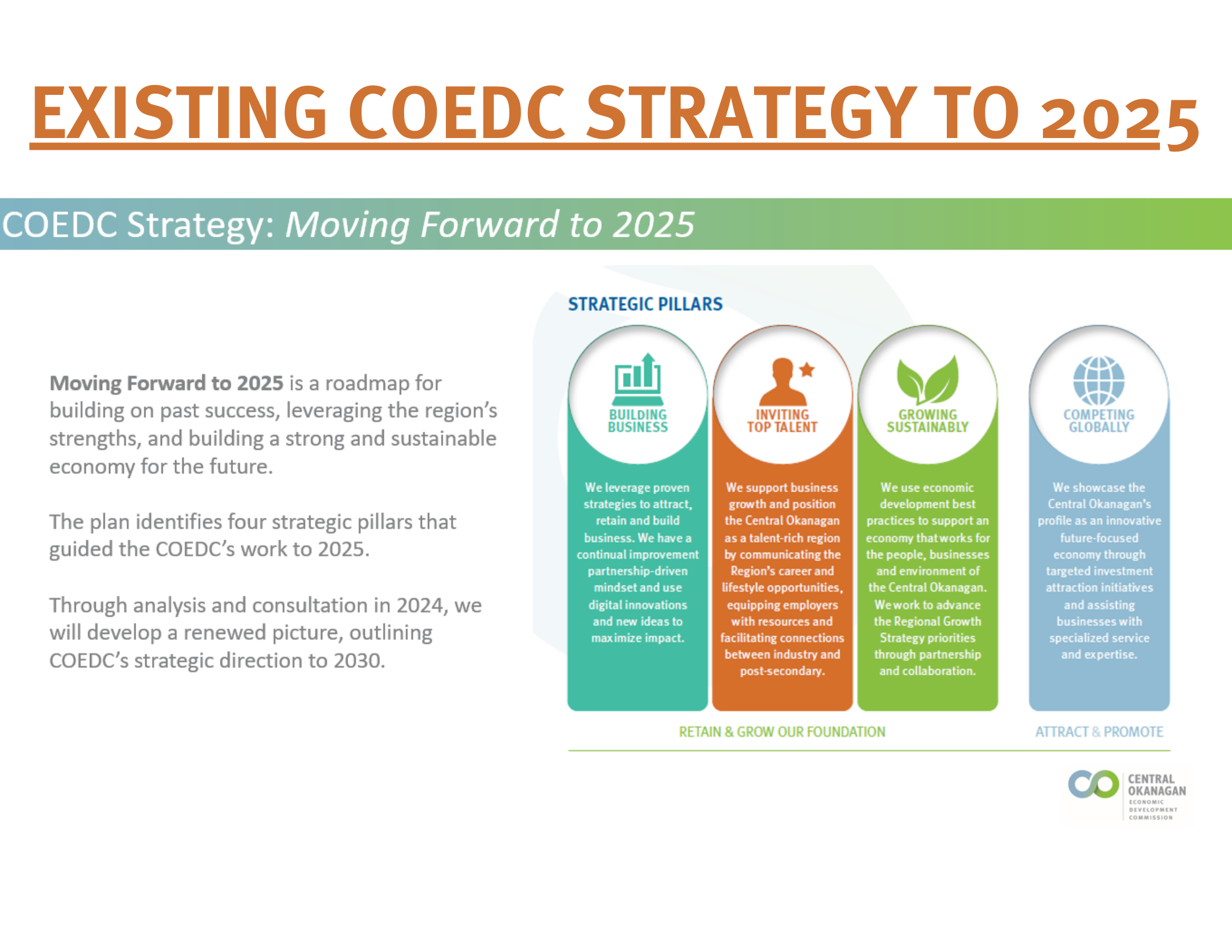 The Central Okanagan Economic Development Commission (COEDC) is in the process of developing a renewed 5-Year Strategy (2025-2030) by evaluating current economic development initiatives, consulting with the community, and identifying regional economic opportunities, the COEDC is committed to encouraging the development of a healthy and dynamic sustainable economy in the Central Okanagan.