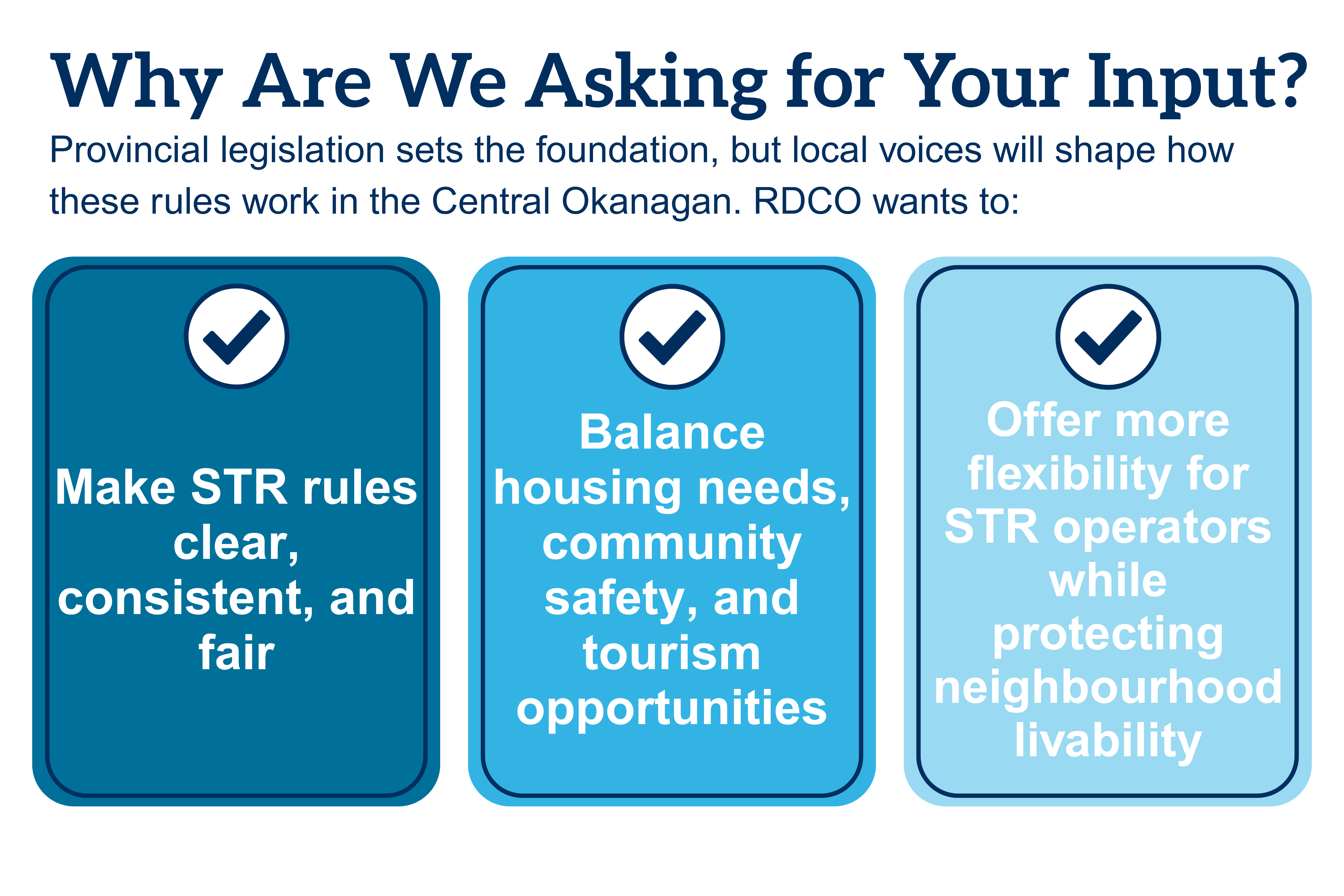 This engagement process will ask residents whether whole-home STRs should be allowed or if RDCO should continue requiring operators to remain on-site within the principal residence or an accessory dwelling unit. Your feedback will help inform changes to relevant bylaws.